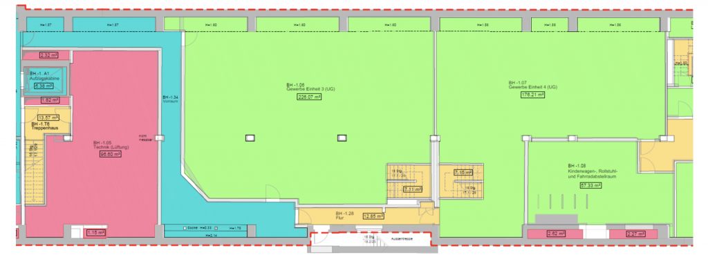 The areas on the ground floor are rented for 35 €/sqm and the areas in the basement ( VB )!