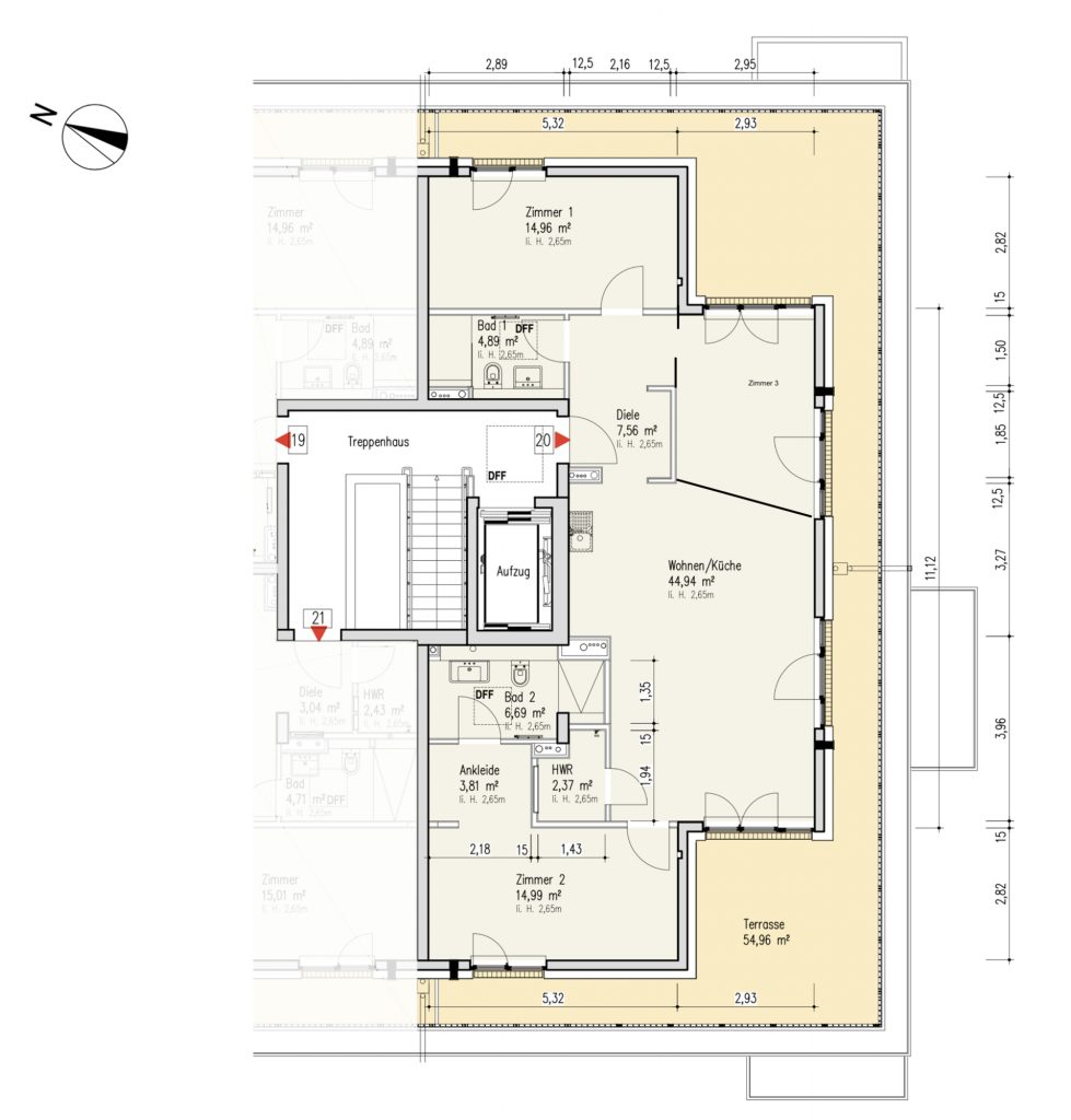 Das angebotene Pentouse mit umlaufender Terrasse befindet sich im 4.Obergeschoss und wird mit einem barrierefreien Aufzug erreicht. Die verarbeiteten Materialien sind hochwertig wie z.b Eichenparkett, Bora Abzug System, Dornbracht Elemente