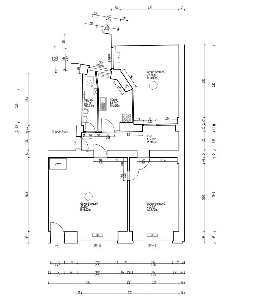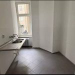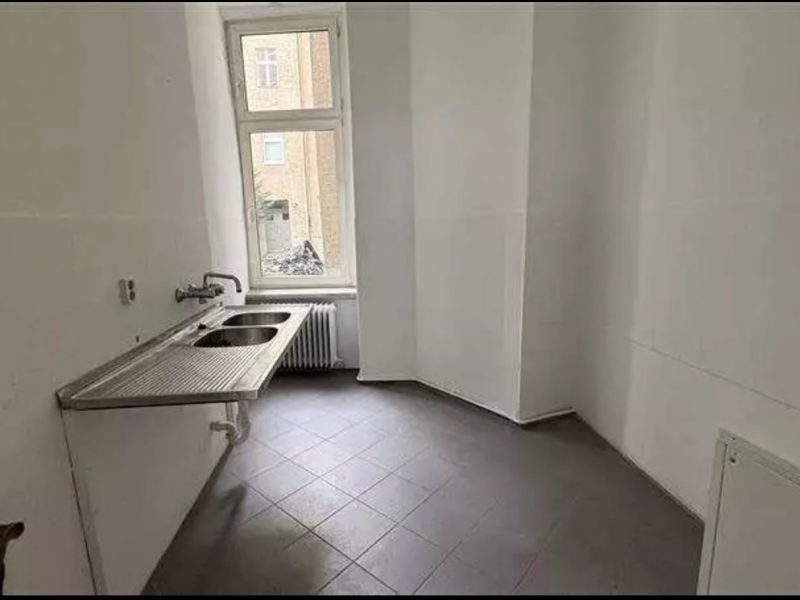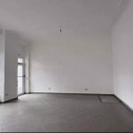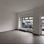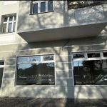 Die Immobilie ist eine Gewerbefläche in unverarbeitetem Zustand, bereit zur Renovierung oder zum Ausbau. Sie verfügt über große Schaufenster zur Straße hin, mehrere Innentüren und eine einfache Ausstattung, die eine funktionale Aufteilung für verschiedene Geschäftsnutzungen ermöglicht. Das Ladenlokal ist der primäre, öffentlich zugängliche Bereich mit großen Schaufenstern für Sichtbarkeit und Tageslicht. Der Boden ist mit dunklen Fliesen ausgelegt, die Wände sind weiß gestrichen. Heizkörper sind vorhanden. Ein hinterer Raum und ein Zwischenraum sind über Türen zugänglich. Ein Küchenbereich ist mit einer großen Edelstahlspüle ausgestattet. Die Böden variieren zwischen dunklen Fliesen, freiliegendem Beton und helleren Belägen, was auf einen Renovierungsbedarf hindeutet. Eine zentrale Heizungsanlage mit Heizkörpern ist vorhanden. Die Fassade des mehrgeschossigen Gebäudes ist gepflegt, mit modernen Fenstern im Erdgeschossbereich.