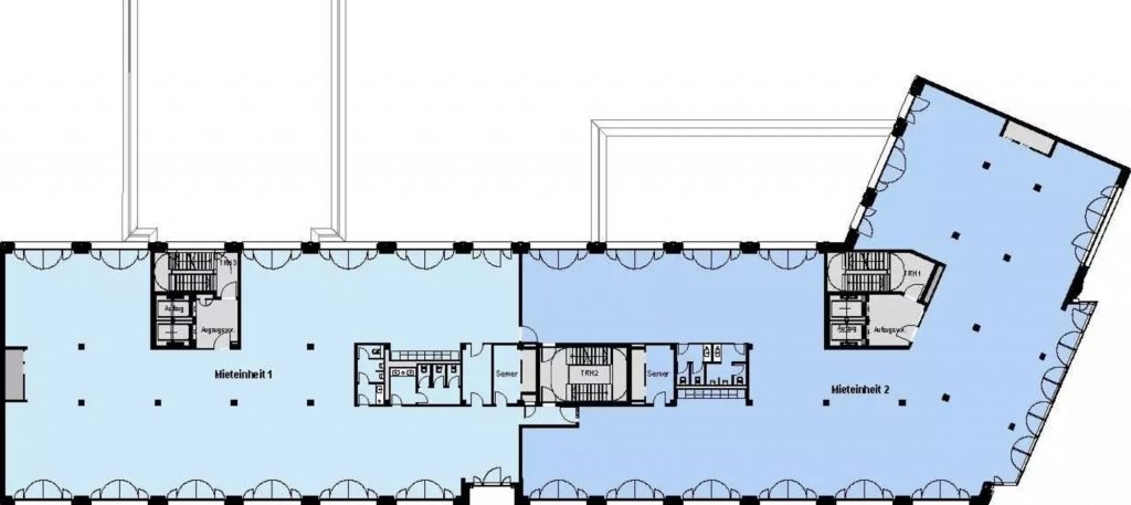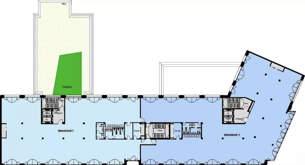 Im Erdgeschoss sind Einzelhandelsflächen vorgesehen. Die Büroflächen befinden sich im 1. bis 6. OG.
