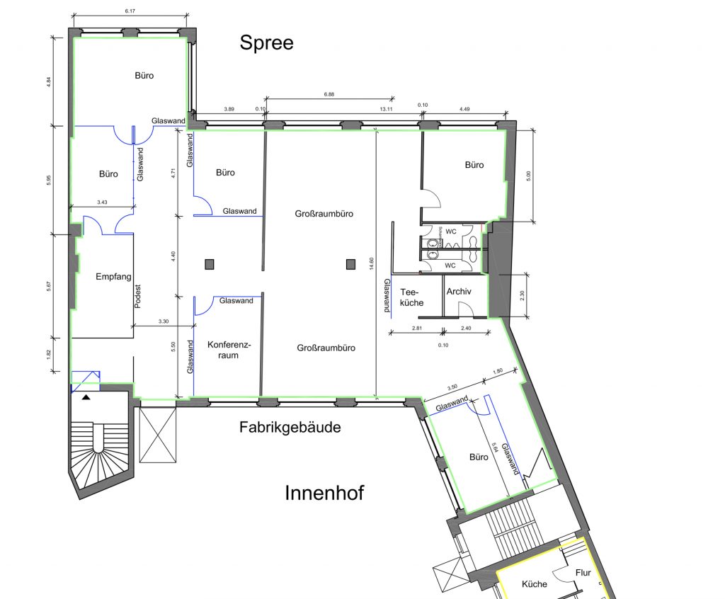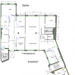 The office and residential building was built in 1911, extensively renovated in 1996 and the attic revitalized. Thanks to its historic facade design, it fits very well into the existing building stock. The front side on the street Alt-Moabit has rich stucco decorations and loggias. The facades in the inner courtyard consist of colored glazed tiles. The building ensemble named Spree-Etagenhof consists of 6 floors with a front building, a side wing and a modern factory building whose rear facade is located directly on the Spree River. The technical equipment of the building corresponds to the current standard.