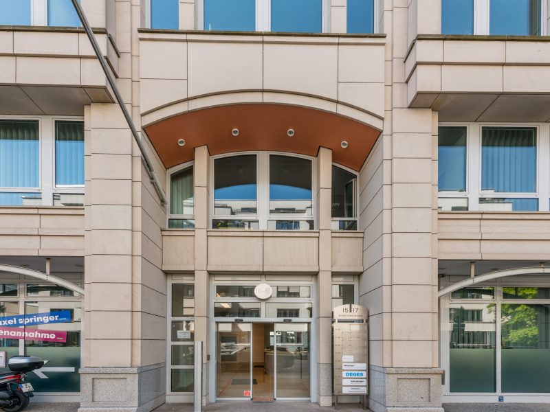 The property is located in the media center in Berlin-Mitte, on the immediate border to the Kreuzberg district, adjacent to Charlottenstrasse and Markgrafenstrasse. It is only a few minutes' walk from Checkpoint Charlie, Gendarmenmarkt, Potsdamer Platz and Friedrichstrasse. The Axel Springer building, a variety of restaurants and shopping facilities as well as cultural venues are in the immediate vicinity. The central location of the office and commercial building offers excellent transport connections in all directions. Tegel Airport (U6 to Französische Str./TXL in approx. 9 minutes), Schönefeld Airport (S9 and DB-Express, Friedrichstraße S-Bahn station in approx. 10 minutes), Tempelhof City Airport (U6 subway station Kochstraße in 3 minutes on foot), U2, Stadtmitte subway station (direction Ruhleben and Pankow in approx. 5 minutes' walk, Alexanderplatz is just a few minutes' drive away), Friedrichstraße S-Bahn and regional train station just a few minutes away on the U6 from Stadtmitte subway station (various S-Bahn lines take you to City-West in approx. 10 minutes and Hackescher Markt in approx. 5 minutes), approx. 15 minutes by car to City-West (Kurfürstendamm, Zoologischer Garten or the city highway).