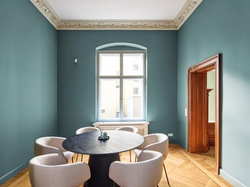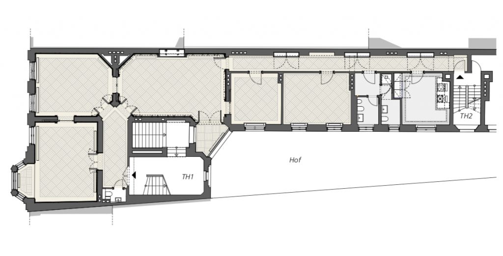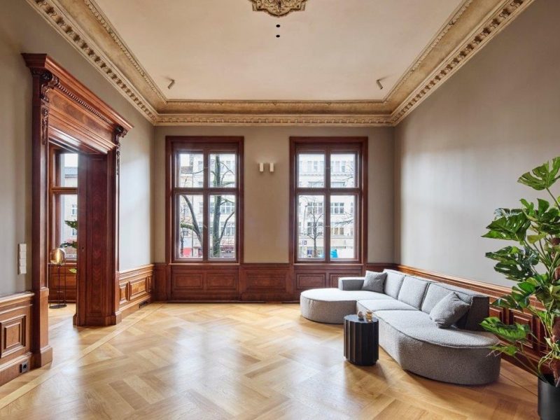 In the front area facing the street are two salons with breathtaking period stucco elements. These have been painstakingly restored and now show the details of their Wilhelminian origins.