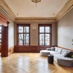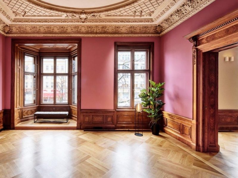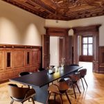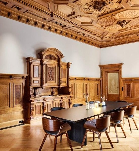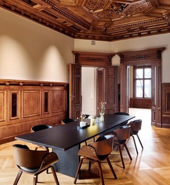 As the unit once served as an office for the adjoining timber factory, the stately rooms were fitted with oak wall paneling and doors with walnut panels. These have now been restored and create a dignified atmosphere.