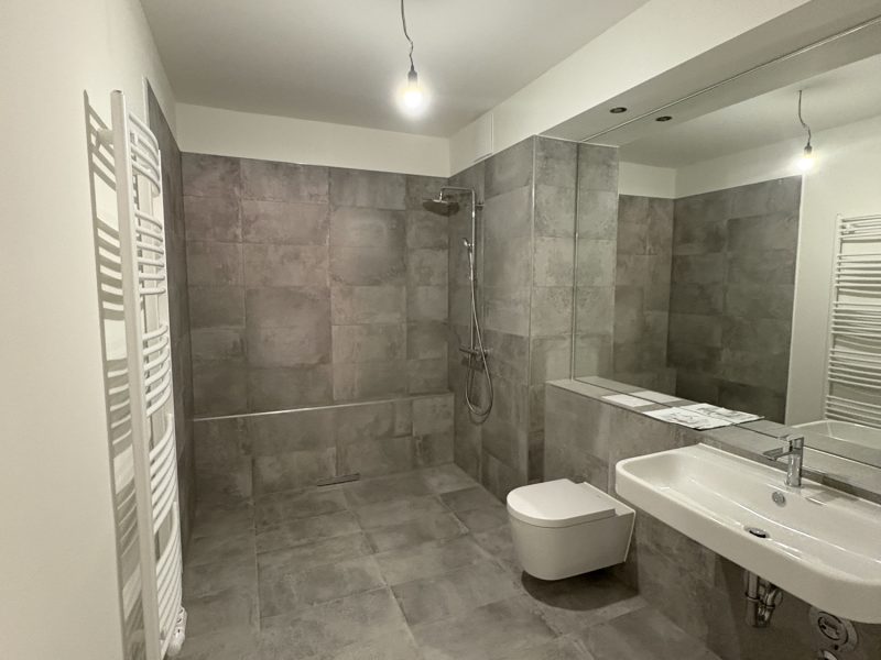 - - gefliestes Bad mit großem Spiegel, wandhängendes WC